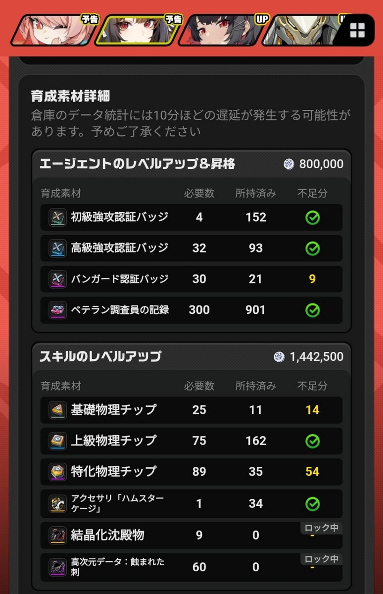 コアスキル用など以外にも、キャラの属性や役割に該当するスキルチップ、キャラのレベル上限を上げるための認証バッジ、音動機のレベル上限を上げるためのキット、使用する予定のドライバディスク、そしてディニーなども集めておくといいですね。